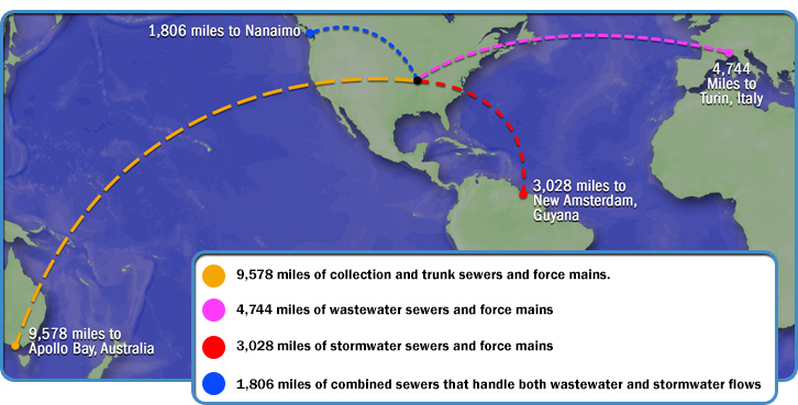 The system currently includes approximately 4,744 miles of wastewater sewers and force mains, approximately 3,028 miles of stormwater sewers and force mains , and approximately 1,806 miles of combined sewers that handle both wastewater and stormwater flows.