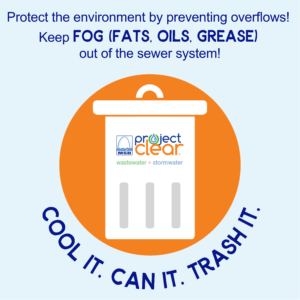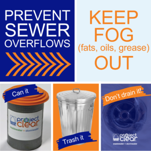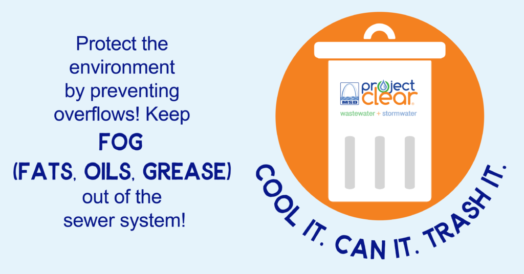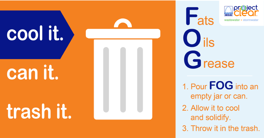 - [YOUR ORGANIZATION] is teaming up with @MSDProjectClear to encourage you to protect your pipes this holiday season by properly disposing of fats, oils, and grease (FOG). FOG from butter, gravy, oil, and sauces can look like harmless liquids, but when it is poured down the drain, it becomes thick and sticky, clogging pipes and causing sewer backups in your home. Instead of pouring it down your drain, dispose of FOG by COOLING IT, CANNING IT, and TRASHING IT.