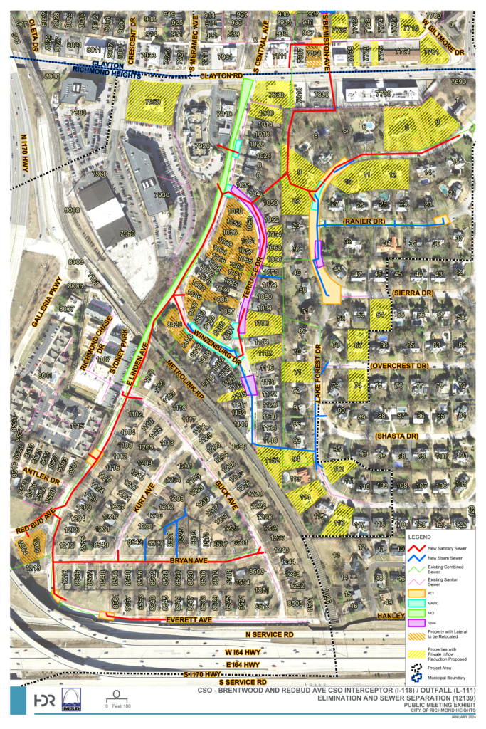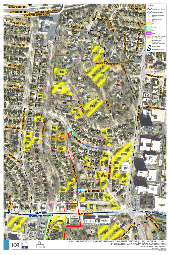 As part of a long-term effort to reduce basement backups and sewer overflows, MSD Project Clear is constructing a project to replace approximately 9,200 feet of undersized wastewater sewers and 4,200 feet of undersized stormwater sewers in the cities of Richmond Heights and Clayton. MSD Project Clear will also disconnect sources where stormwater and groundwater enter the wastewater sewers (known as inflow and infiltration) from approximately 24 private properties.