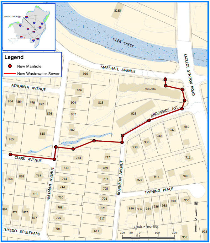 Traffic and Access: As much of the construction will take place in the street, residents should expect temporary lane closures on Brookside Avenue, Robinson Avenue, Yeatman Avenue and Clark Avenue. MSD Project Clear will maintain at least one lane of traffic at all times to allow residents to enter and exit. However, a full road closure will take place on Marshall Avenue for a small duration of time at the beginning of the project.