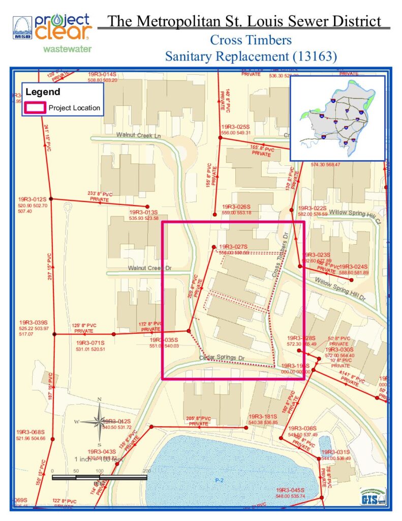 - MSD Project Clear will construct approximately 412 feet of 8-inch wastewater pipe, 516 feet of 2-inch force main, four grinder pump systems and appurtenances.
