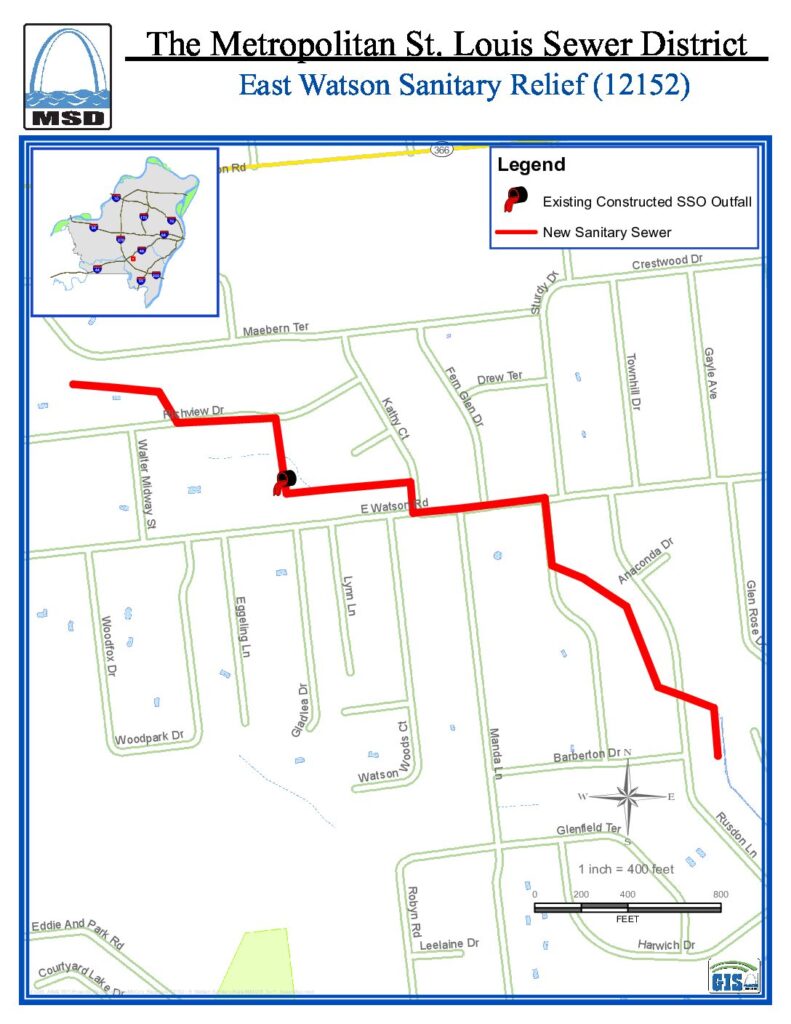 As part of a long-term effort to reduce basement backups and sewer overflows, MSD Project Clear is constructing approximately 4,580 feet of sewer in the Citys of Sunset Hills and Crestwood. The East Watson Sanitary Relief project will increase the size of the wastewater sewer which will reduce basement backups and prevent sewer overflows in this area. Construction is scheduled to begin in Spring of 2021 with anticipated completion in the Fall of 2022.