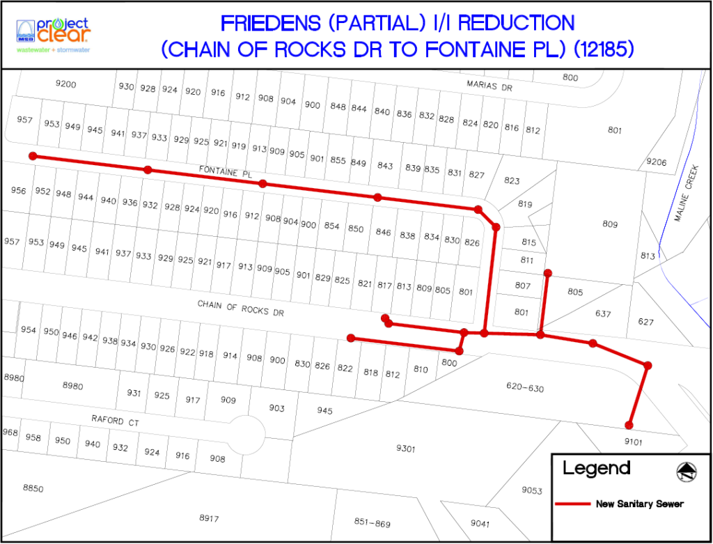 Traffic and Access: As much of the construction will take place in the street, residents should expect temporary lane closures on Fontaine Place and Chain of Rocks Drive. MSD Project Clear will maintain at least one lane of traffic at all times to allow residents to enter and exit.