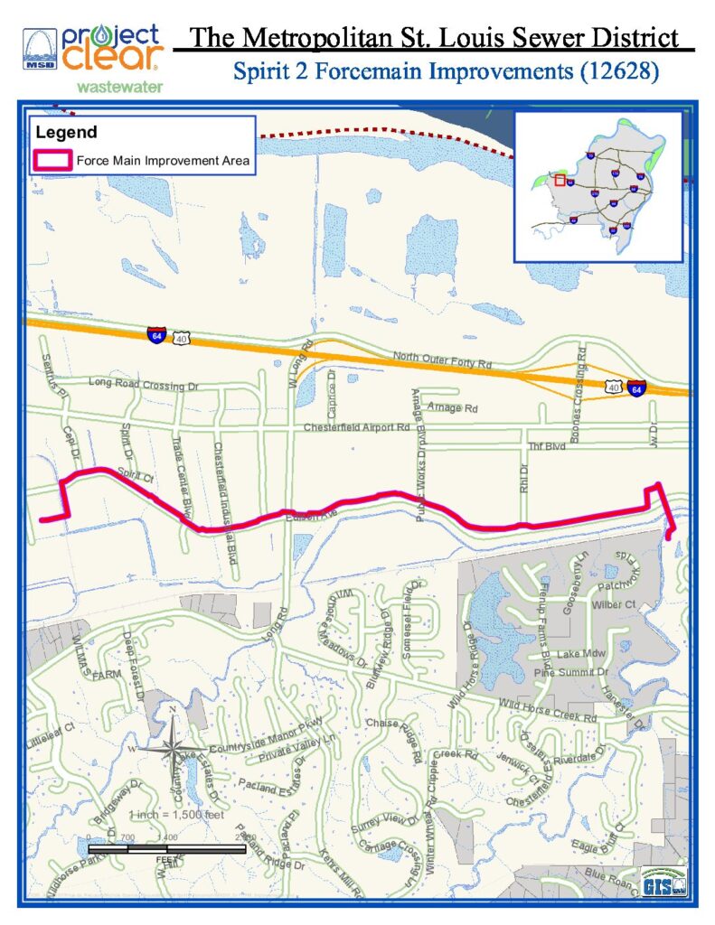 MSD Project Clear is investing approximately $19 million to improve the wastewater sewers in the City of Chesterfield. The goal is to replace the degraded Spirit 2 Force Main pipe with a new pipe, identical in size to the existing force main to renew the usable life of the force main.