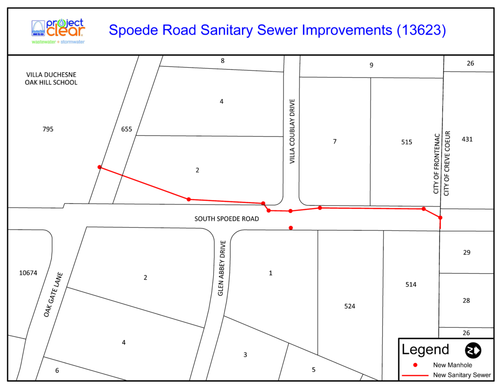 Traffic and Access: As much of the construction will take place in the street, residents should expect temporary lane closures on Spoede Road and Villa Coublay Drive. MSD Project Clear will maintain at least one lane of traffic at all times to allow residents to enter and exit.