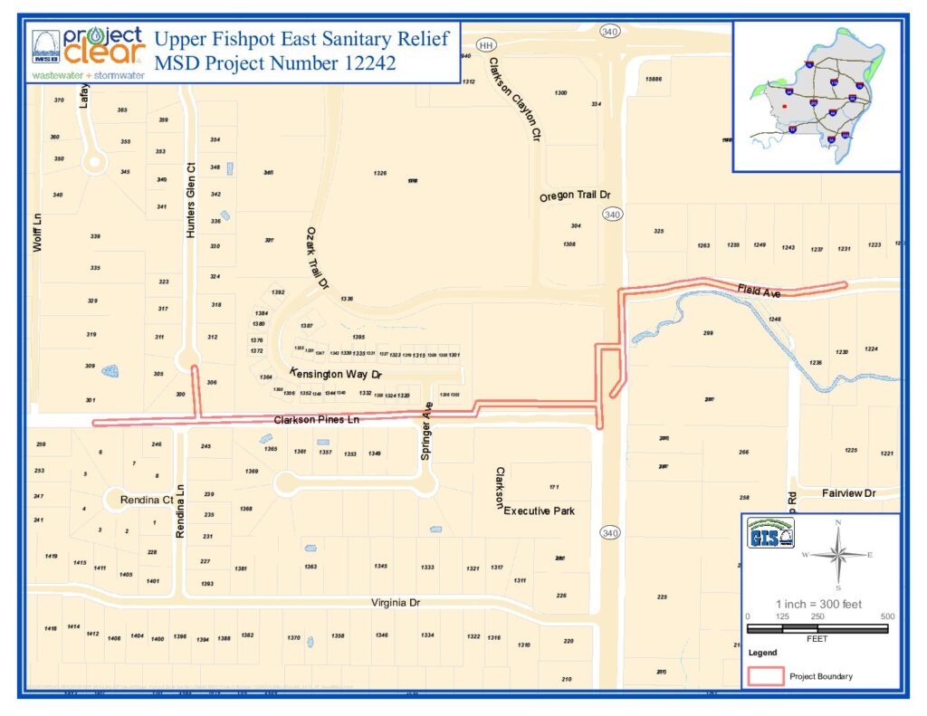 Traffic and Access: As some of the construction will take place in the street, residents should expect temporary lane closures on Field Avenue, Clarkson Pines Lane and Hunter’s Glen Court. MSD Project Clear will maintain at least one lane of traffic at all times to allow residents to enter and exit.
