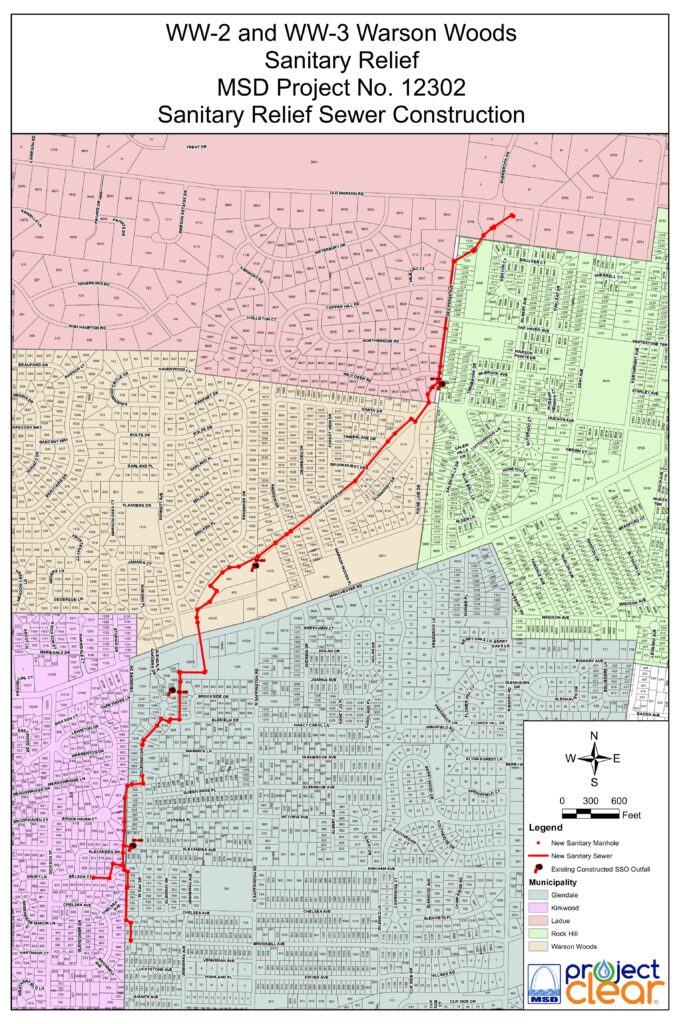 As part of a long-term effort to reduce basement backups and sewer overflows, MSD Project Clear is constructing a project to replace approximately 10,000 feet of undersized wastewater sewers in the cities of Warson Woods, Ladue, Kirkwood, Rock Hill and Glendale. In addition, approximately 140 feet of natural creek will be stabilized to reduce creek bank erosion and improve water flow.