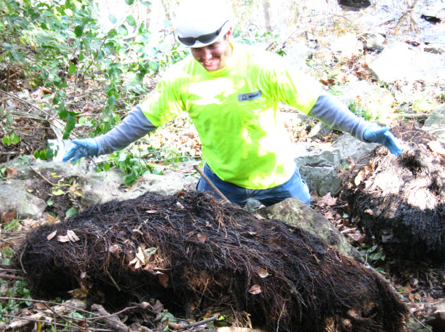 22 inches in diameter and 5 feet long, this root ball weighed between 150 lbs (dry) and 200 lbs (wet). A root of this size likely infiltrated a wastewater sewer pipe because most of the major trunk sewers are made of clay in 3 to 4 foot sections. Tree roots, seeking water, are strong enough to penetrate the joint connections and grow to this size within the pipe.